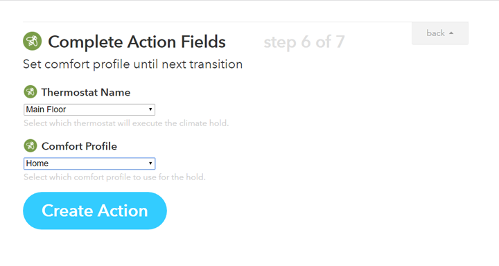 You will also need to select the right thermostat and comfort profile for this to work. If you are entering the circle you would select home if you are leaving you would select away. If you have more than one thermostat you will need to set up a duplicate recipe for that one as well.
