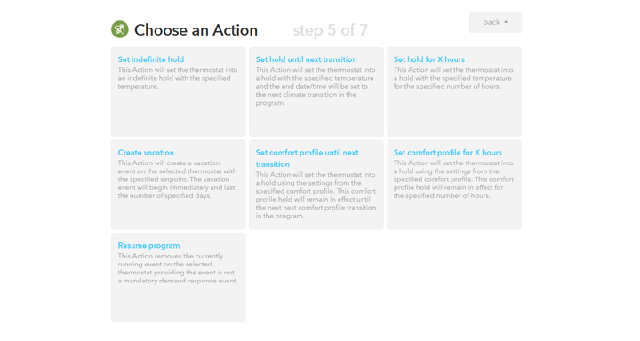 The next step involves selecting an action. Here you can choose from a few different options but for the purpose of Geo-fencing you will want to select set comfort profile until next transition.