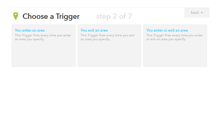Your IF statement will start with the Android Location or iOS Location for "This". After you successfully select Android Location or iOS Location you will be prompted to select a trigger. Setting up Geo-fencing will require two separate recipes, one will trigger when you enter an area (Set the system to Home), and the other will trigger when you leave an area (Set the system to Away).